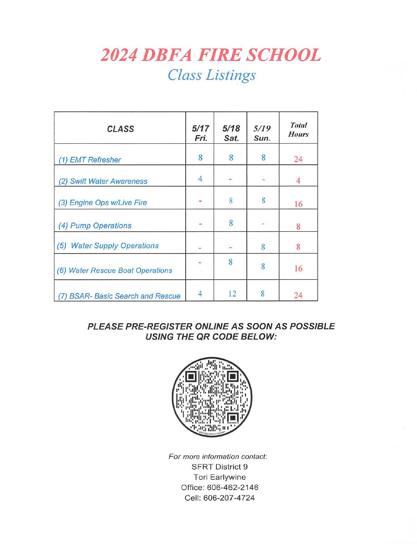 The 2024 Daniel Boone Firefighters Association Fire School will be held on May 17-19 at the SFRT District 9 Office located at 99 Lake Park Drive, Morehead, KY. The classes are free, and lunch is provided. Please use this link for registration.